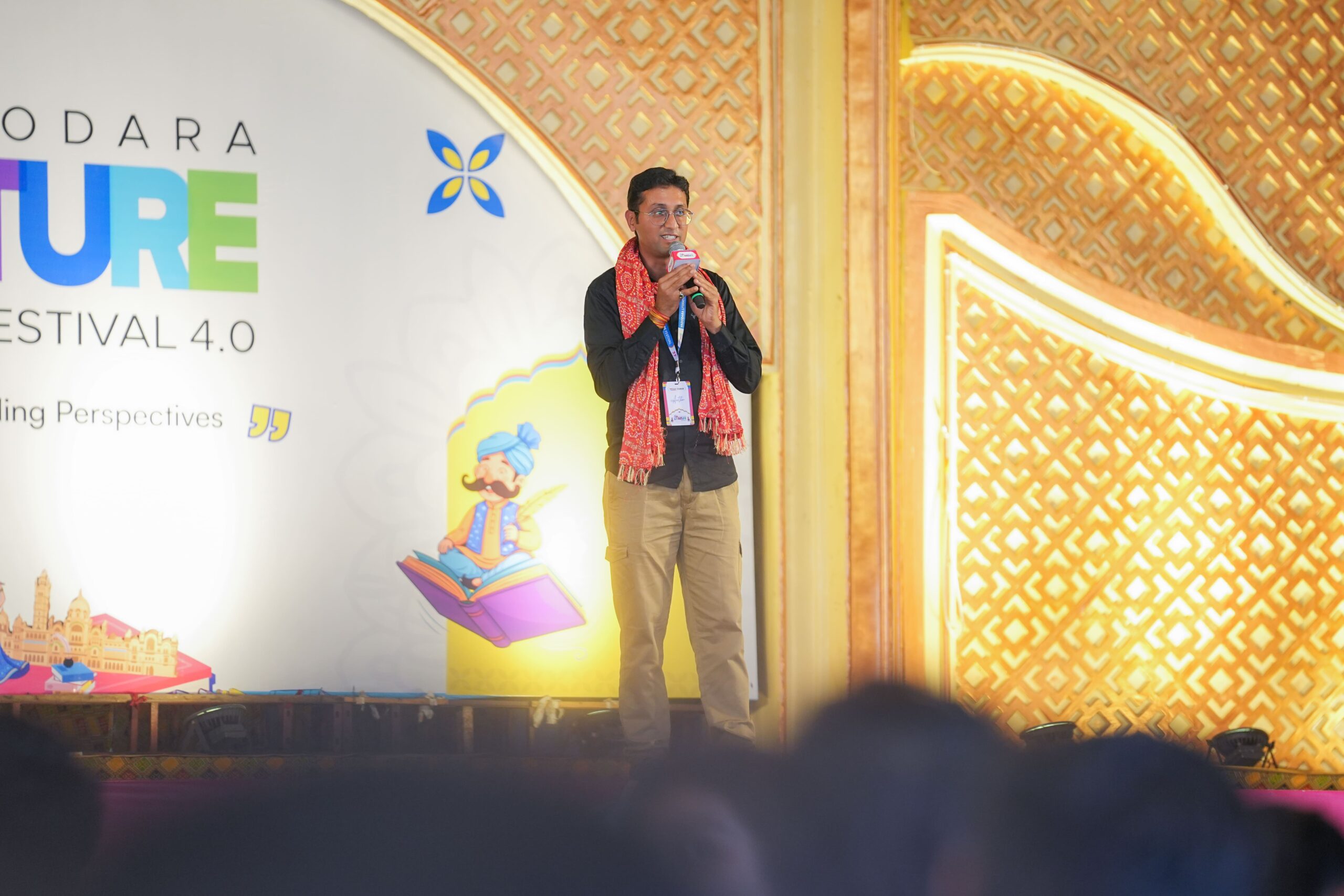 By any standard measurement of success at a literature festival, Ekagra Sharma’s VLF – Vadodara Literature Festival 4.0 presence was exceptional. He performed on Day 1 at the Central Auditorium, returned on Day 2 at Tagore’s Shantiniketan, and appeared again on Day 3.