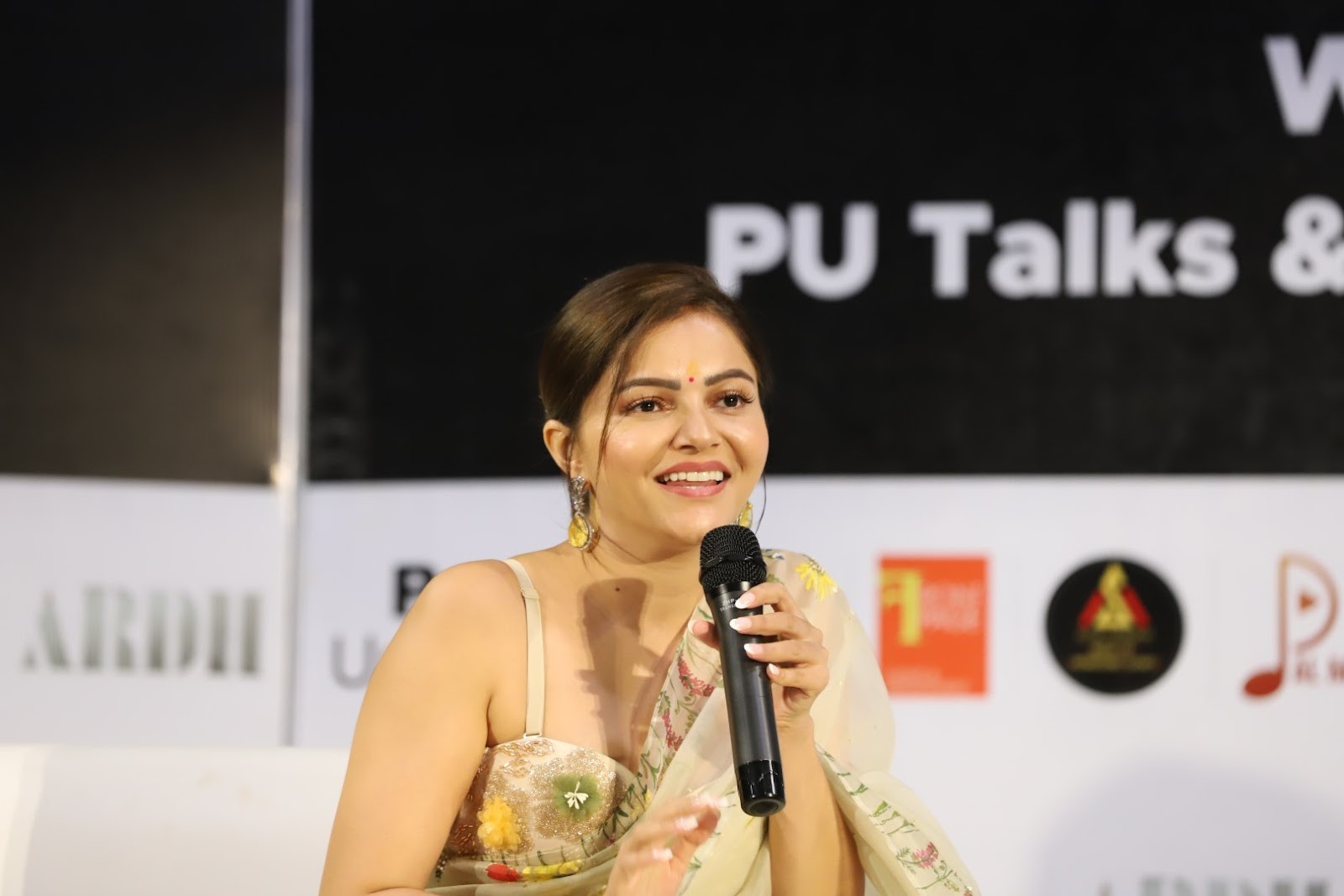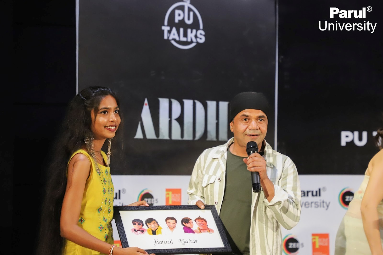 Vadodara city’s PU is known for going that extra mile to provide their students with growth opportunities outside of the classroom. The university has taken the initiative of starting “PU Talks” where esteemed guests from different fields such as art, politics, business and science, among others are called to interact with students. The latest guests to grace this student inspiration platform were Rajpal Yadav (actor), Rubina Dilaik (actress), and Palash Muchhal (Music composer and director.) They were present in the city to exclusively launch the trailer of their latest movie “Ardh” which is scheduled for an OTT release on 10th June on Zee 5. Palash Muchhal is making his directorial debut and the Big Boss season 14 winner Rubina is making her Bollywood debut with this latest movie.