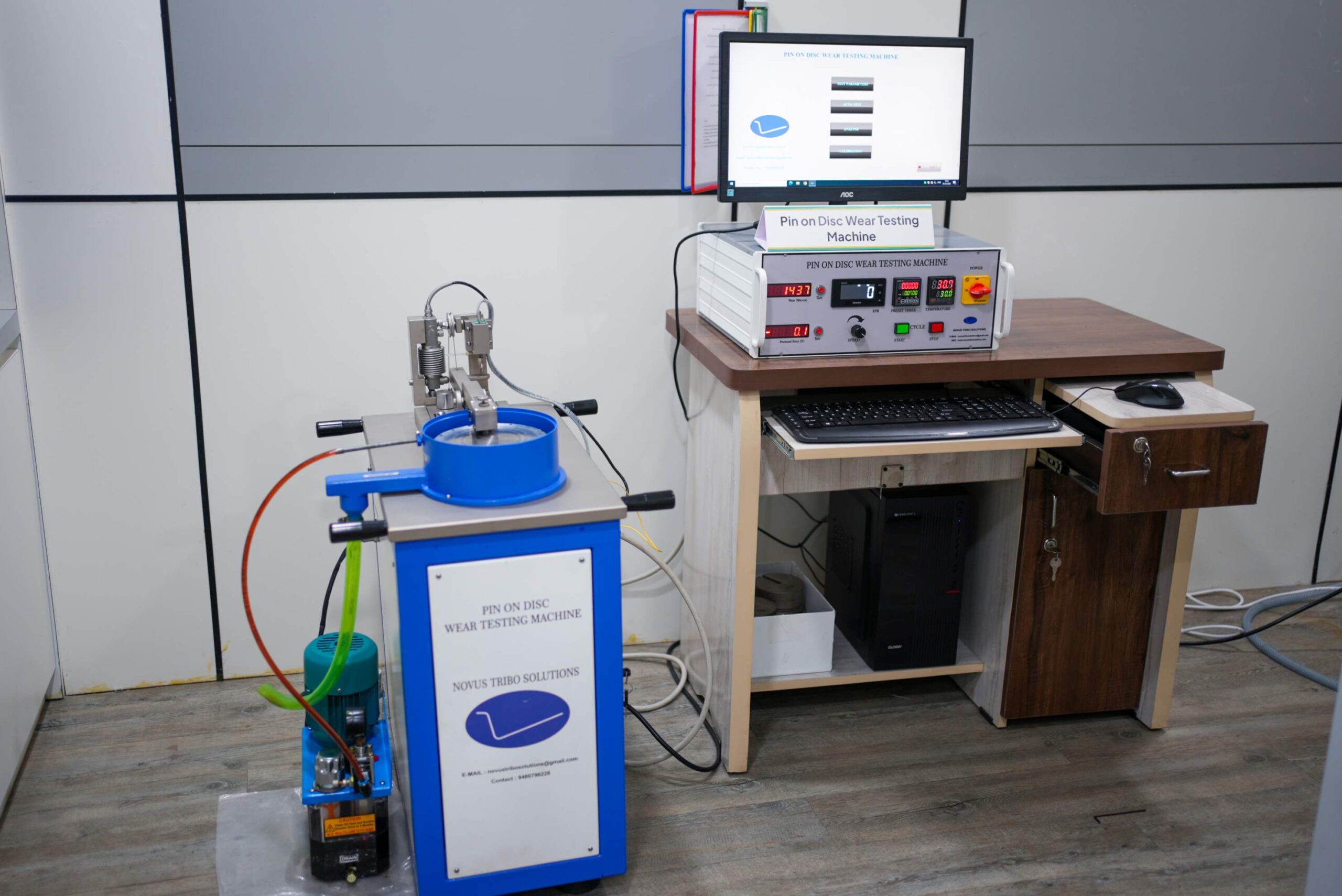 • Wear rate, friction coefficient, and material durability under sliding conditions are evaluated using a Pin-on-Disc Tribometer following ASTM G99 standards.
