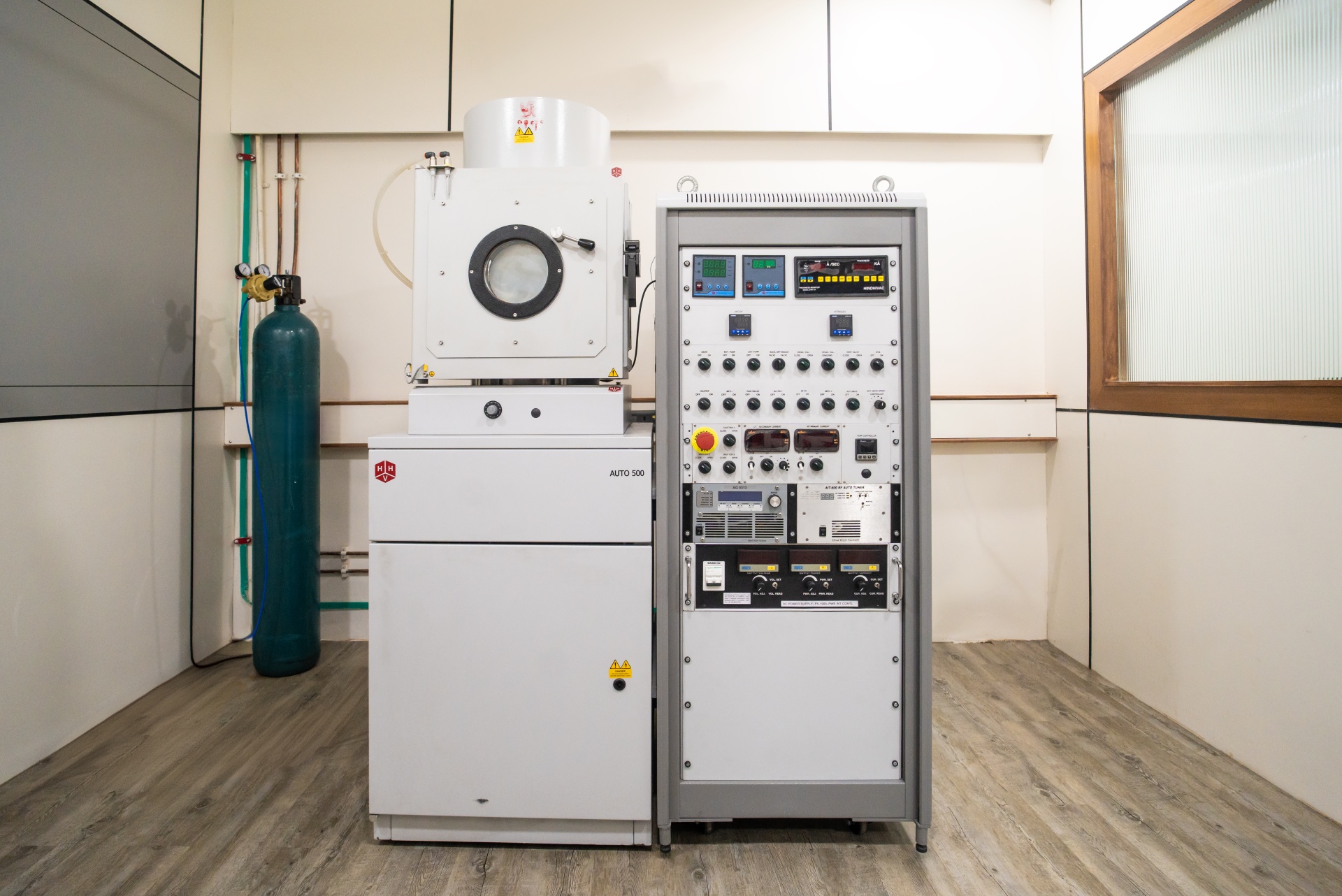The Auto 500 vacuum chamber is a 500mm × 500mm × 500mm stainless steel enclosure with front-loading access. The vacuum system uses a rotary pump for initial roughing (reducing pressure from atmospheric to ~10^-2 Torr) followed by a turbomolecular pump for high-vacuum conditions (achieving ~10^-6 Torr) – eliminating virtually all air molecules from the deposition path. Chamber pump-down takes approximately 15 minutes to reach the deposition-ready vacuum.