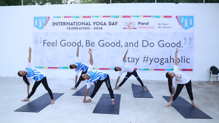 The fourth International Day of Yoga program organized by the Dept. of Swasthavritta, Parul Institute of Ayurveda on June 21, 2018 began with the morning one hour (7.00 am-8.00 am) Mega Yoga Session inaugurated by Dr. Vijayakumar, Registrar, Parul University in the main ground, Parul University campus with 1000 participants (faculties, UG students of Parul University) that included deputy registrar, Dean and HOI of various Institutes of Parul University strictly following the “Common Yoga Protocol” that had already been promulgated by CCRYN and Department of AYUSH, Government of India.